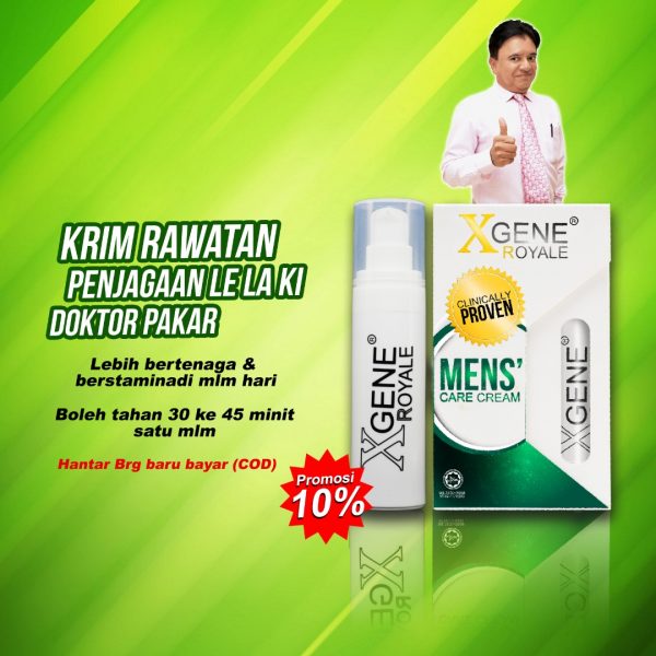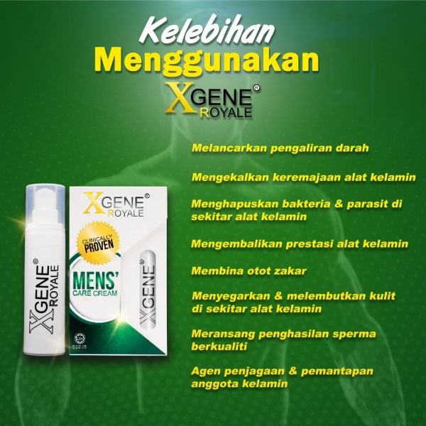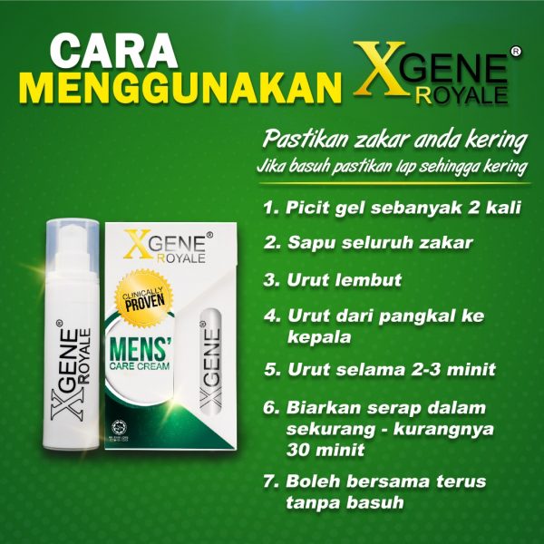 XGENE ROYALE merupakan krim sapuan luaran yang diperkaya dengan Tongkat Ali yang dirumus khas. Formulasi khusus XGENE ROYALE juga merupakan krim perapian genital melalui pendekatan penjagaan anggota kelamin lelaki untuk tujuan kesihatan, pemantapan dan kekuatan genital iaitu pendekatan yang terbaik untuk mengawal dan memantapkan organ kompleks lelaki.